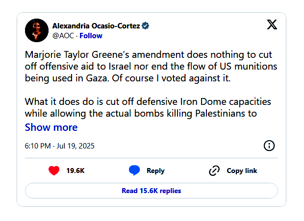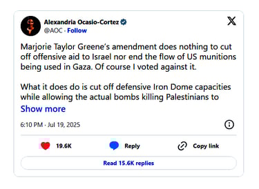 Last month, Ocasio-Cortez said that the United States should reconsider its policy of unconditional military aid to Israel, arguing that it "enabled a genocide in Gaza" and contributed to the deaths of thousands of women and children.