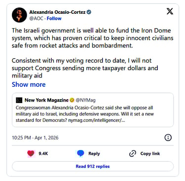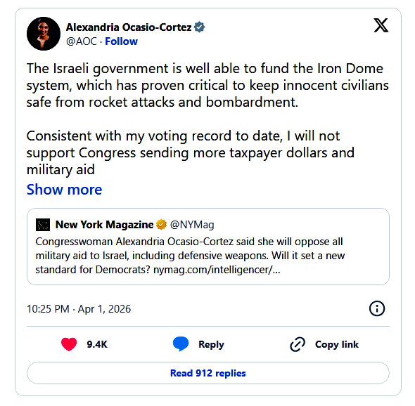 AOC Vows to Vote Against All Military Aid to Israel, Including Iron Dome Funding