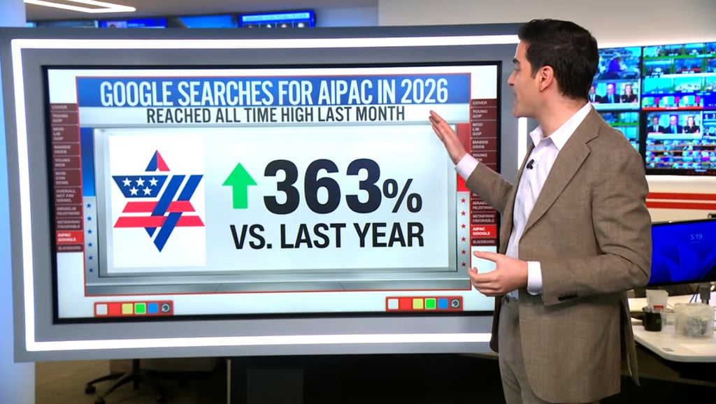 Google searches for AIPAC in 2026, up like a rocket, up 363% versus last year, reached an all-time high last month.