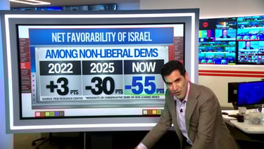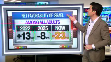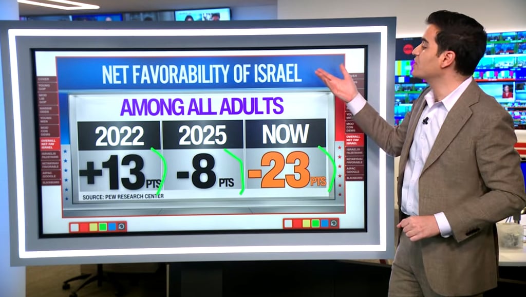 Harry Enten discusses the declining popularity of Israel in the U.S., showing data that reveals a sharp drop in net favorability: